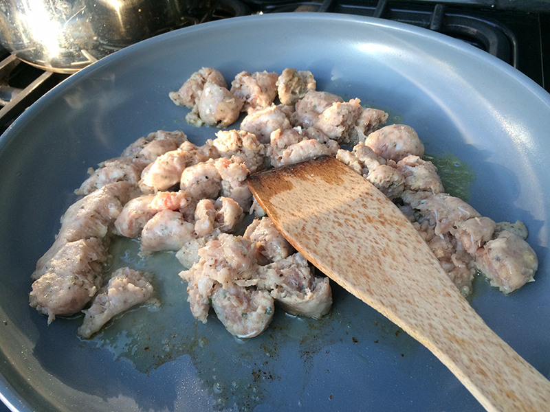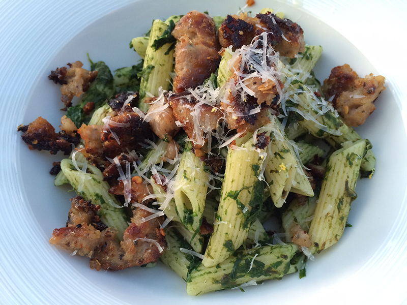 I was lucky enough to have a bag of wild garlic given to us last week, my immediate thought was “oh great! I’ll stick it in a stir fry!”. Which is my thought to most vegetables… it’d be great with pork and soy sauce, or beef with oyster sauce. But then I came across this Jamie Oliver recipe. A wild garlic and sausage fusilli, it is the perfect after work, after school dinner! Sausage and pasta… what’s not to like?